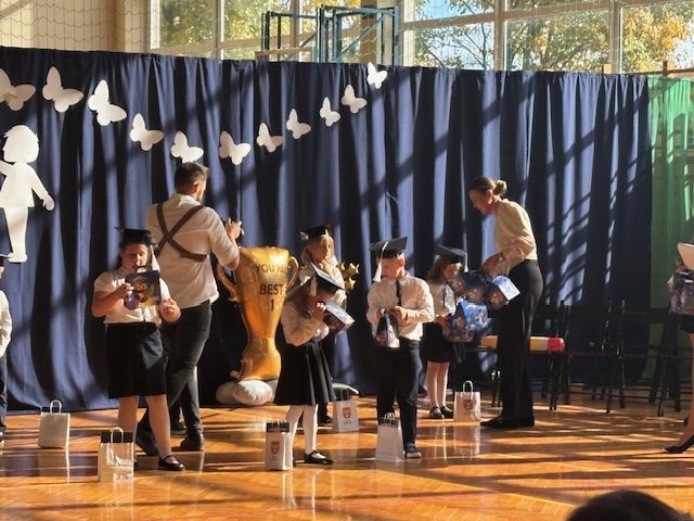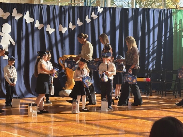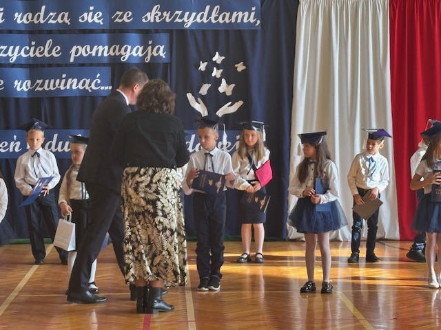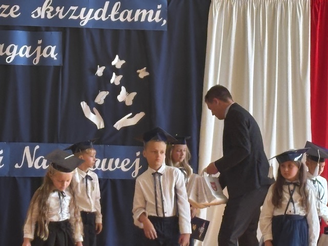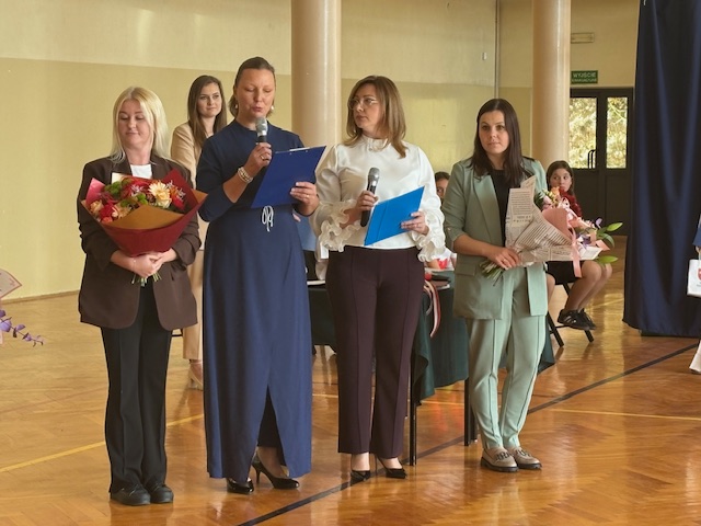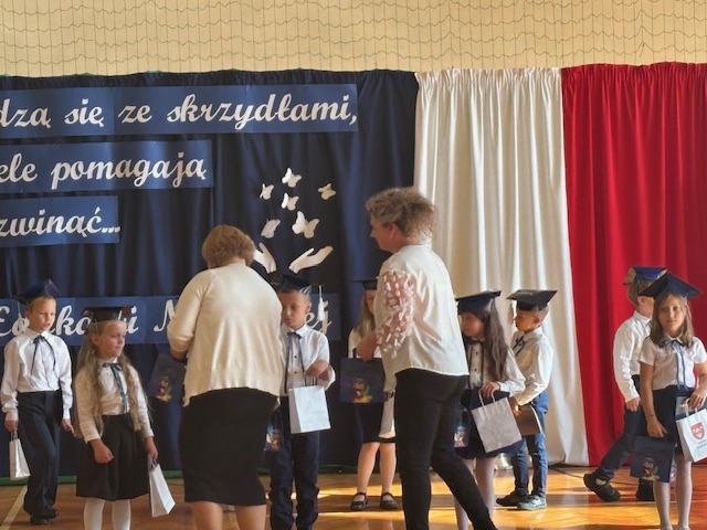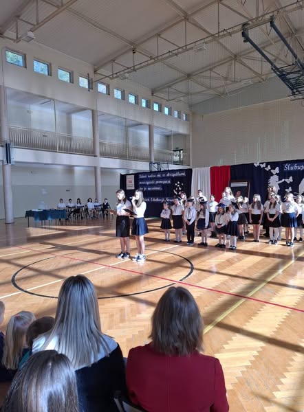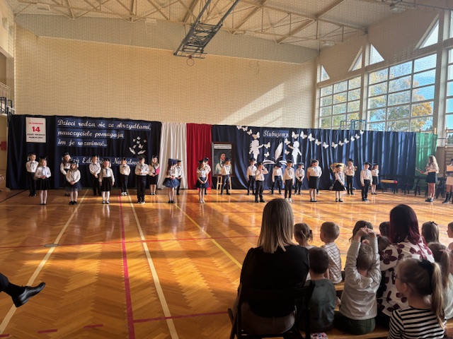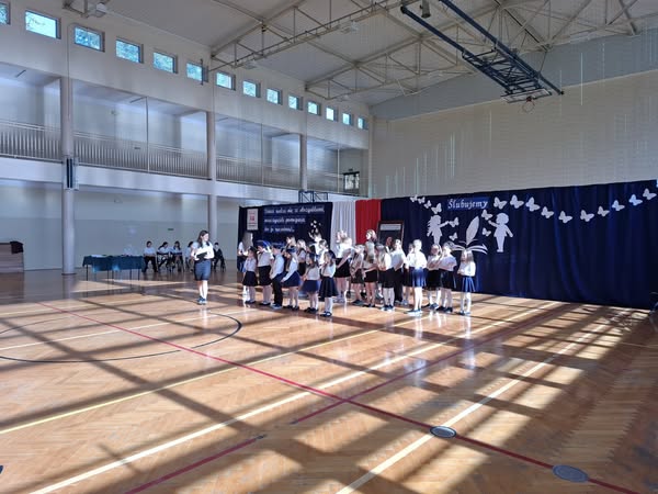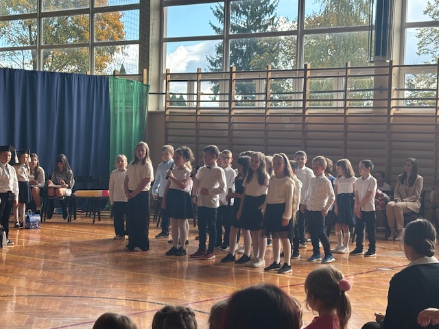 To był moment, gdy atmosfera stała się naprawdę rodzinna. Na scenie błyszczała grupa „SMILE” pod kierunkiem pani Marty Majewskiej — ich występ łączył precyzję tanecznych figur ze swobodą wokalnych aranżacji, a energia, którą wnieśli, udzieliła się wszystkim. Pierwszaki natomiast — mali odkrywcy i sportowcy — pokazały, że odwaga i ciekawość świata idą w parze z urokiem. Ich piosenki były pełne spontaniczności i autentycznego wdzięku; pasowanie stało się nie tylko formalnością, lecz prawdziwym świętem wejścia do szkolnej rodziny. Prowadzące akademię wprowadzały kolejne punkty programu z elegancją i humorem — było schludnie, punktualnie i z poczuciem smaku. Całość została spleciona tak, że wszyscy wyszli z niej z przeświadczeniem: to był dzień, w którym szkoła pokazała, że uczy i wychowuje, ale też potrafi świętować. Na koniec — jak to w prawdziwym święcie bywa — kwintesencją było to, co najprostsze: uśmiechy dzieci, wzruszenia wychowawczyń p. Kasi i p. Karoliny i gromkie brawa. Akademia przypomniała nam pamięć najpiękniejszych szkolnych chwil. Bo tego dnia wszystko miało znaczenie — każde słowo, każdy taneczny krok i każda nuta wyśpiewana z serca. Pierwszoklasiści z dumą dołączyli do grona uczniów, nauczyciele usłyszeli słowa wdzięczności, a emerytowani pedagodzy mogli poczuć, że ich praca i oddanie wciąż są żywe w pamięci szkolnej społeczności. To była akademia z duszą — ciepła, radosna i pełna emocji. Pokazała, że nasza szkoła to nie tylko miejsce nauki, ale też przestrzeń, w której rośnie dobro, wdzięczność i prawdziwa radość bycia razem.