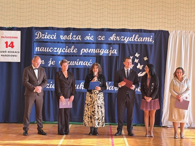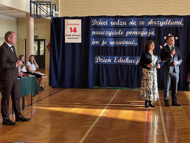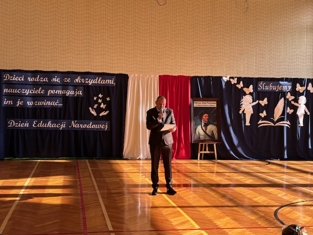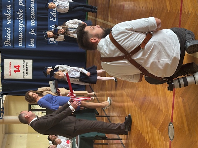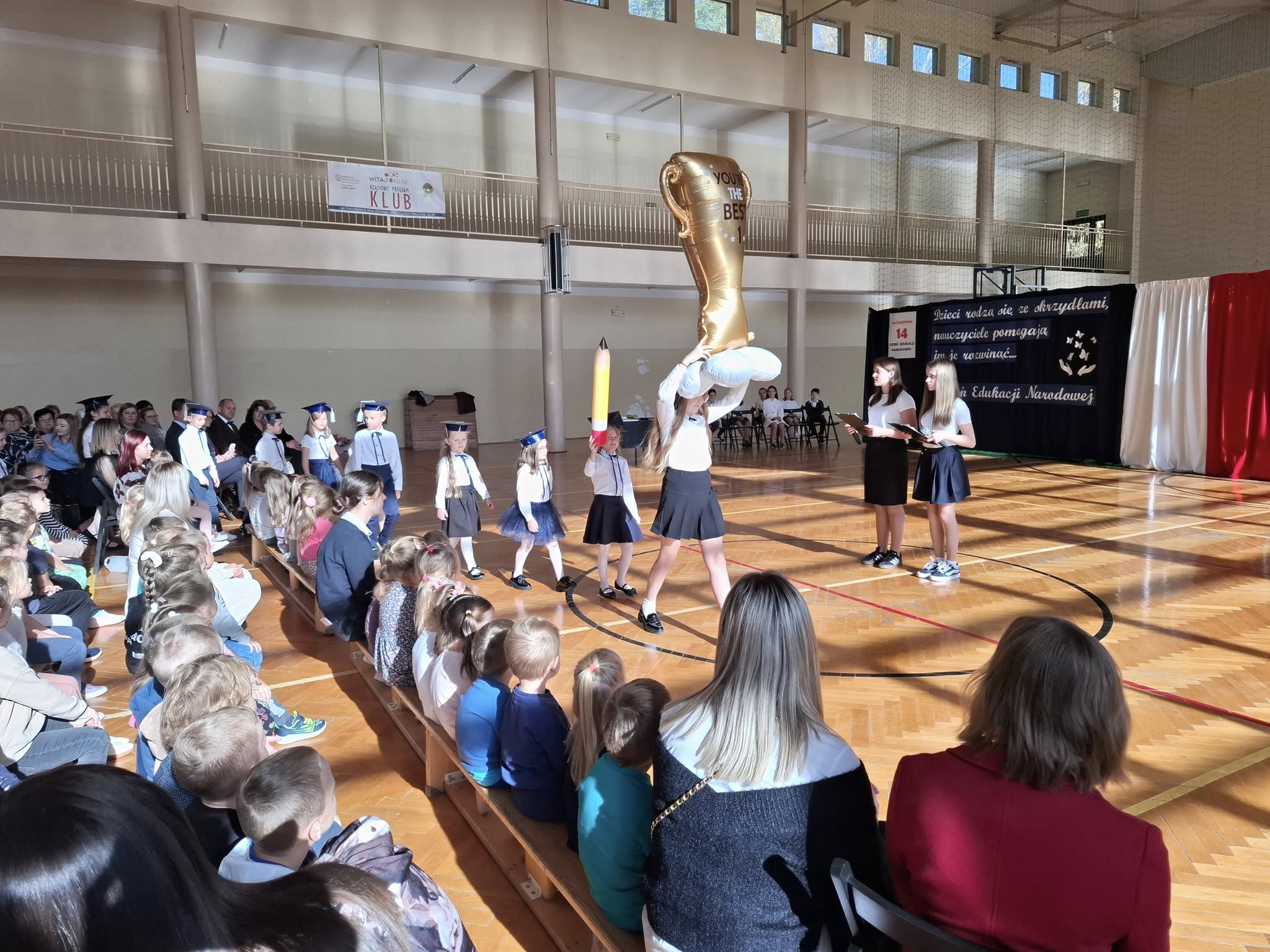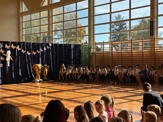 13 października szkolna hala zamieniła się w prawdziwe widowisko: połączyliśmy obchody Dnia Edukacji Narodowej z uroczystym pasowaniem Pierwszaków — i wyszło to tak, jak powinno: z sercem, humorem i nutą wzruszenia. Publiczność nie zdążyła złapać oddechu, zanim na scenie pojawiły się pierwsze talenty. Program artystyczny rozpoczął się od spektakularnego wprowadzenia naszych pierwszoklasistów. A potem to już tańce przeplatały się z wzruszającymi wierszami, a piosenki płynęły jedna za drugą, budząc uśmiech i – nie oszukujmy się – łezkę w oku. Szczególne miejsce w programie zajęli nasi emerytowani pracownicy — dla nich przygotowano piękny list, który został przeczytany przez Natalię Szczęsną ucz. klasy V z wielką czułością i zaangażowaniem.