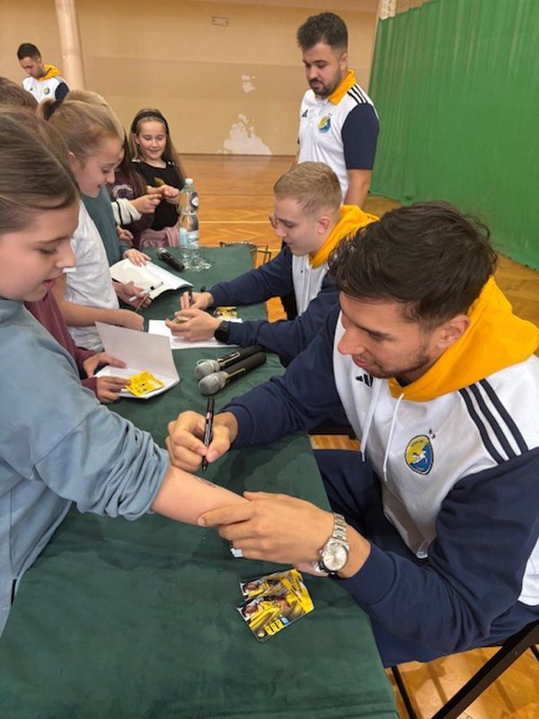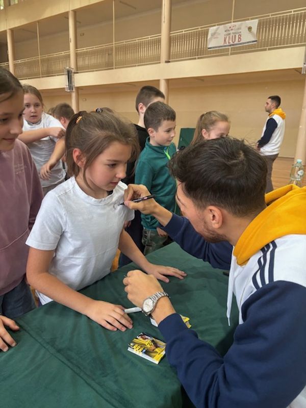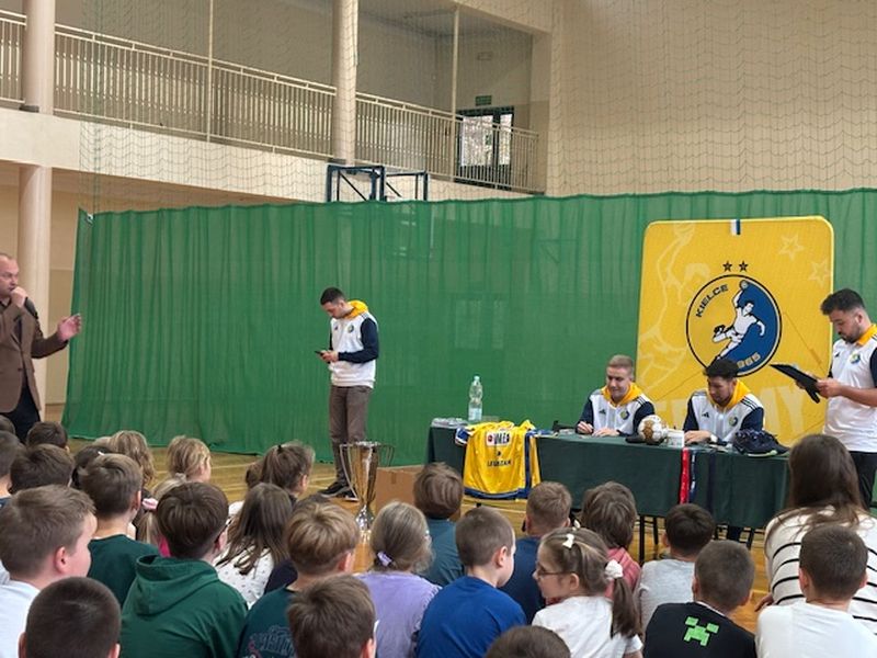 3 listopada naszą szkołę odwiedzili zawodnicy Industrii Kielce – Daniel Dujshebaev i Piotr Jędraszczyk. Spotkanie z mistrzami Polski i zdobywcami Ligi Mistrzów było dla uczniów wyjątkowym wydarzeniem. Goście opowiadali o swojej sportowej drodze, zaprezentowali klubowe trofea oraz zachęcali młodzież do aktywności fizycznej. Na zakończenie przekazali naszej szkole vouchery na ligowy mecz w Kielcach, który odbędzie się 15 listopada. Dziękujemy za niezapomniane spotkanie!