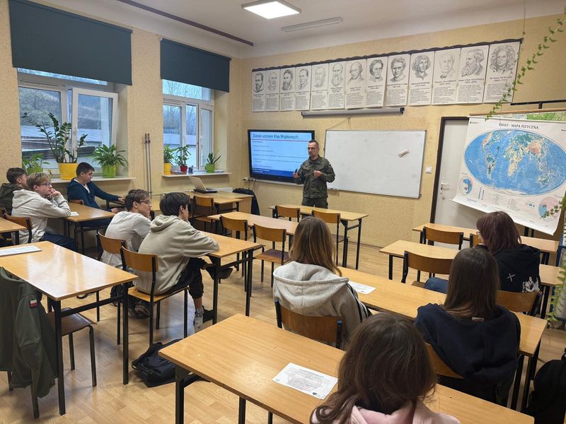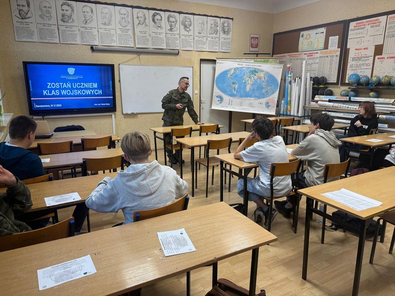 W dniu 17 listopada odbyło się spotkanie z przedstawicielami Wojskowego Centrum Rekrutacyjnego w Sandomierzu, panem chorążym Robertem Bryłą i panią szeregowym Marzeną Wójcik. W interesujący sposób zaprezentowano program nauczania w klasach mundurowych znajdujących się pod opieką WCR w Sandomierzu. Został przedstawiony system rekrutacji i korzyści dla uczniów chcących kształcić się w tego typu klasach. Młodzież z zainteresowaniem wysłuchała przedstawionych informacji .W przyszłości przy wyborze dalszej edukacji z pewnością wezmą je pod uwagę.