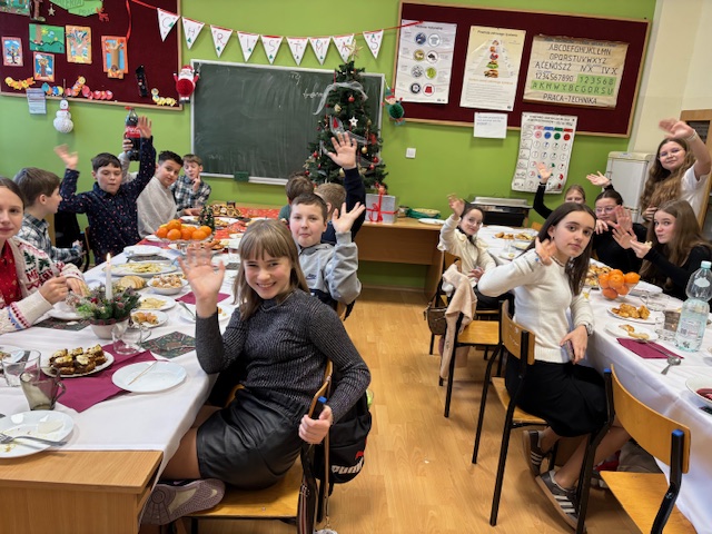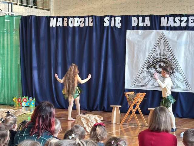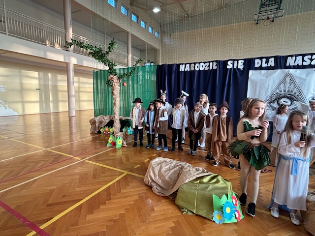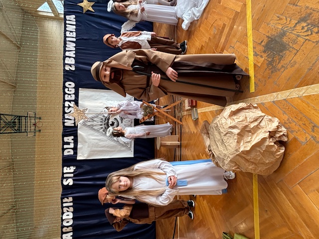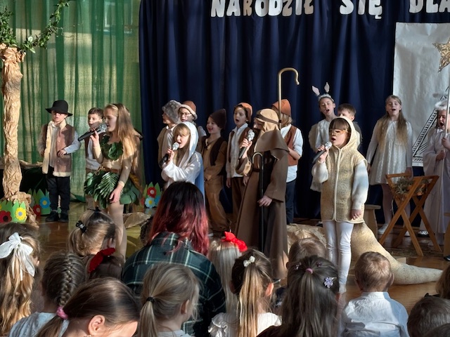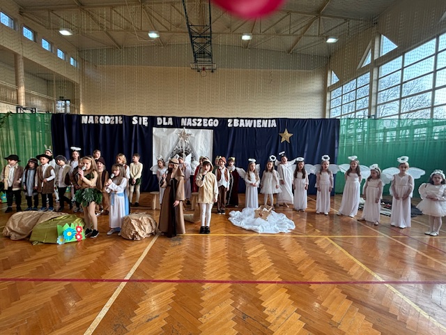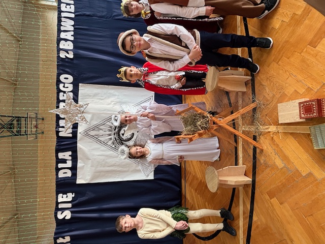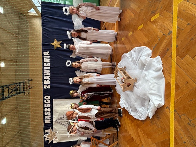 W naszej szkole odbyły się wyjątkowe jasełka przygotowane w absolutnie nowatorskiej formie przez panią Dorotę Stefaniak. Spektakl był całkowicie pozbawiony słów. Dzieci występujące w rolach aktorów opowiadały historię wyłącznie ruchem, gestem i ekspresją ciała. Mimo braku dialogów każdy z obecnych bez trudu rozumiał przekaz i sens kolejnych scen, śledząc je z dużym skupieniem.
