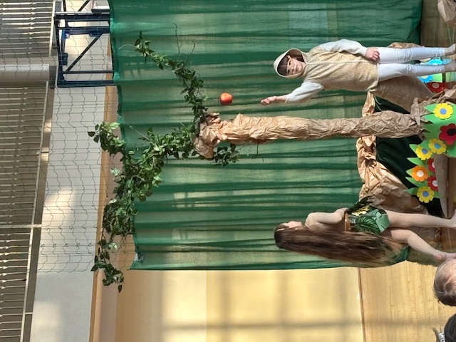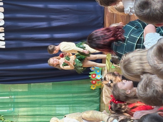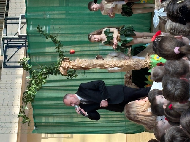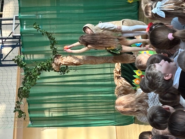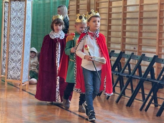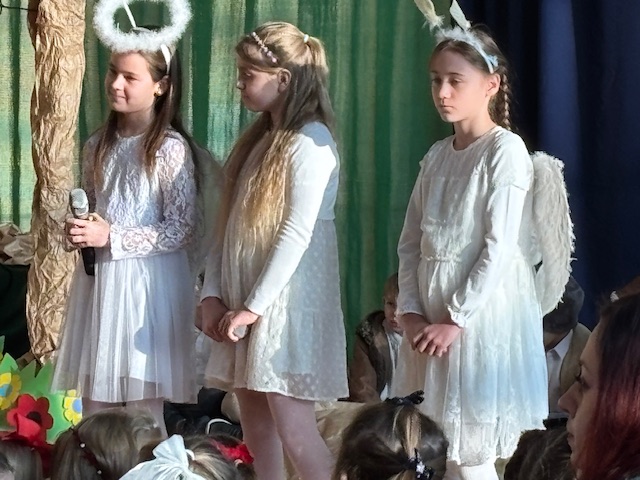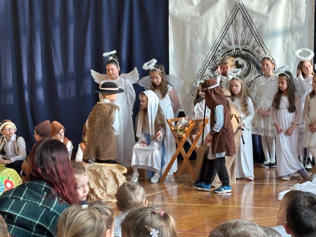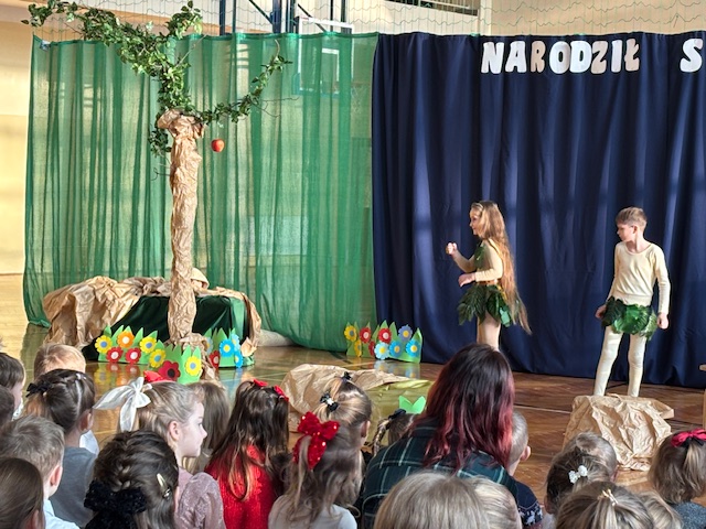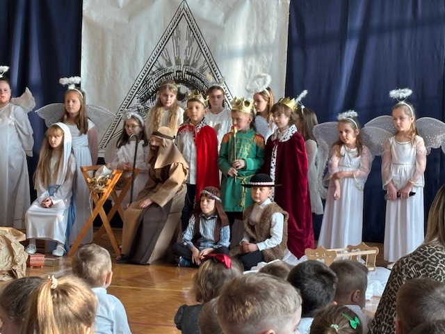 Przedstawienie prowadziło widza od historii Adama i Ewy oraz wygnania z raju, poprzez narodziny Jezusa w betlejemskiej stajence, aż po wizytę Trzech Króli. Każda scena była czytelna, spójna i symboliczna, a dzieci z niezwykłą dojrzałością oddały emocje towarzyszące biblijnym wydarzeniom. Na szczególne uznanie zasługiwały piękne i starannie przygotowane stroje, które dopełniały całości i podkreślały charakter poszczególnych postaci. Całość została wzbogacona przemyślaną oprawą muzyczną oraz wzruszającymi kolędami, które wprowadzały widzów w świąteczny, refleksyjny nastrój. Jasełka w tej odsłonie były dowodem na to, że teatr szkolny może przybierać nowoczesne i nieoczywiste formy, a dzieci – prowadzone z wyczuciem i wrażliwością – potrafią przekazać głębokie treści w sposób prosty, poruszający i w pełni zrozumiały dla odbiorców. Ogromne brawa dla młodych aktorów oraz serdeczne podziekowania złożył również uczniom i pani Dorocie dyrektor szkoły, pan Mariusz Mierzwa oraz zaprosił wszystkich do klas aby kontynuować tę piekną tradycję podczas klasowych wigilii.