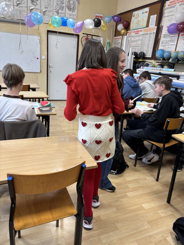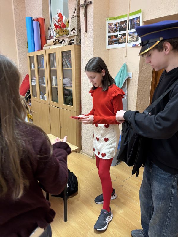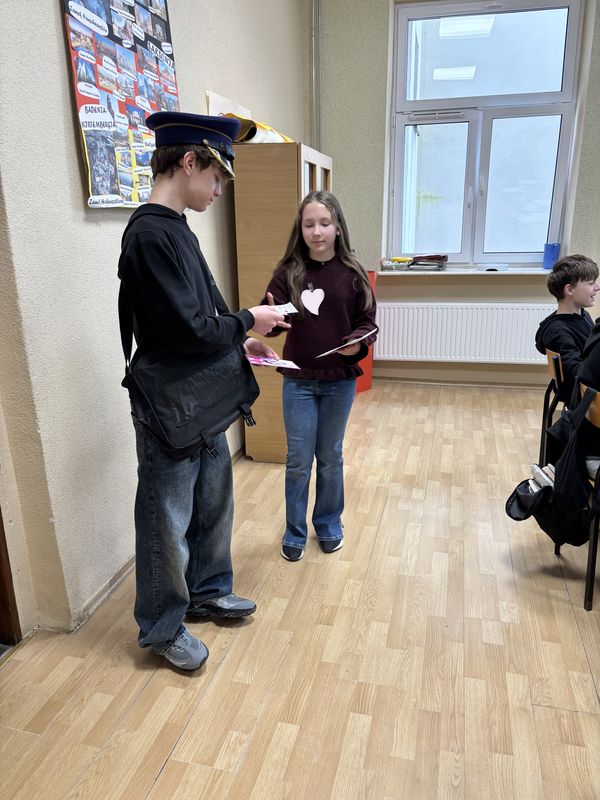 W naszej szkole, jak co roku, działała poczta walentynkowa, która wzbudziła wiele emocji i radości wśród uczniów. Szkolny listonosz – Wiktor z klasy VIII – wraz ze swoją pomocnicą Natalią z klasy V roznosili walentynkowe kartki od klasy do klasy, wywołując uśmiechy i rumieńce na twarzach adresatów.