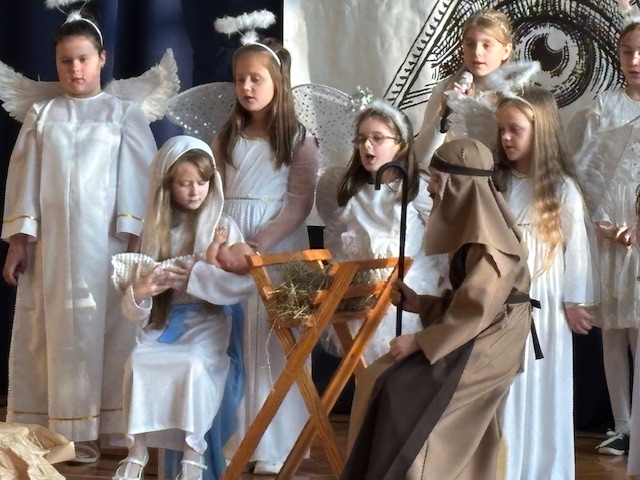 W naszej szkole odbyły się wyjątkowe jasełka przygotowane w absolutnie nowatorskiej formie przez panią Dorotę Stefaniak. Spektakl był całkowicie pozbawiony słów. Dzieci występujące w rolach aktorów opowiadały historię wyłącznie ruchem, gestem i ekspresją ciała. Mimo braku dialogów każdy z obecnych bez trudu rozumiał przekaz i sens kolejnych scen, śledząc je z dużym skupieniem.