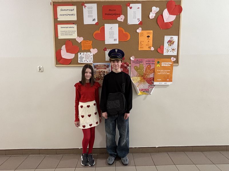 W naszej szkole, jak co roku, działała poczta walentynkowa, która wzbudziła wiele emocji i radości wśród uczniów. Szkolny listonosz – Wiktor z klasy VIII – wraz ze swoją pomocnicą Natalią z klasy V roznosili walentynkowe kartki od klasy do klasy, wywołując uśmiechy i rumieńce na twarzach adresatów.