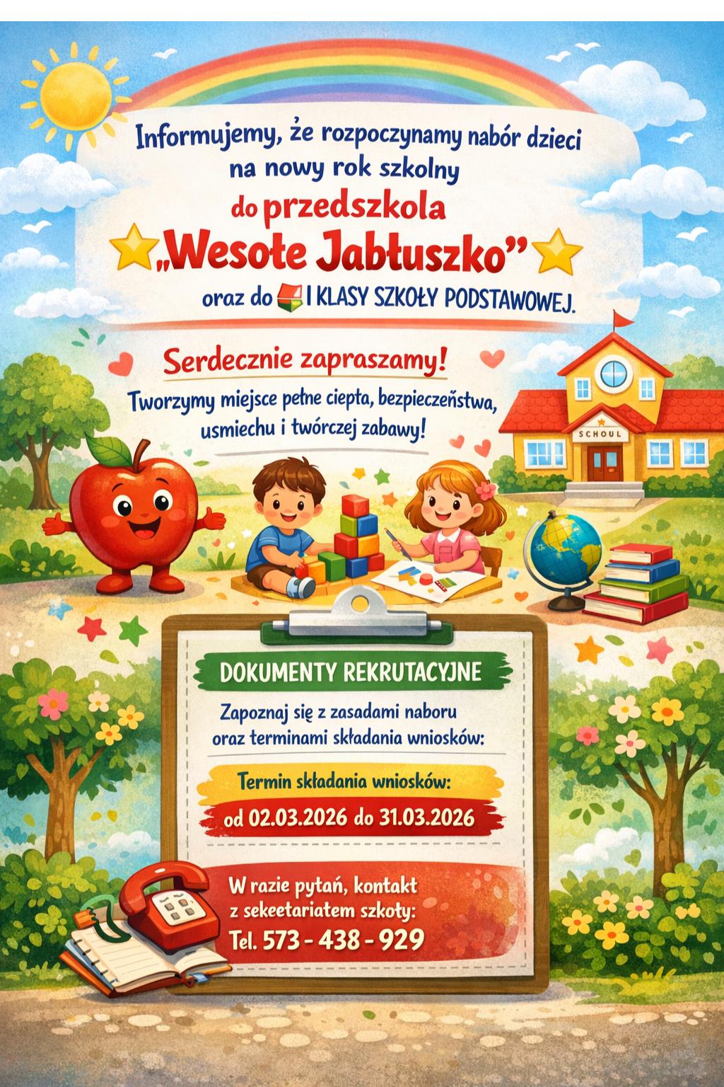 Informujemy, że rozpoczynamy nabór dzieci na kolejny rok szkolny do naszego przedszkola 🌟 „Wesołe Jabłuszko” 🌟oraz do 📚 I klasy szkoły podstawowej. Serdecznie zapraszamy Rodziców do zapoznania się z ofertą naszej placówki. Tworzymy miejsce pełne ciepła, bezpieczeństwa, uśmiechu i twórczej zabawy. Dbamy o wszechstronny rozwój dzieci, rozwijamy ich talenty i przygotowujemy do kolejnych etapów edukacji.