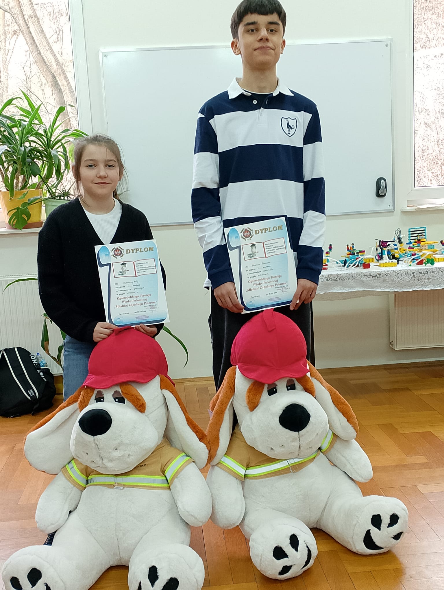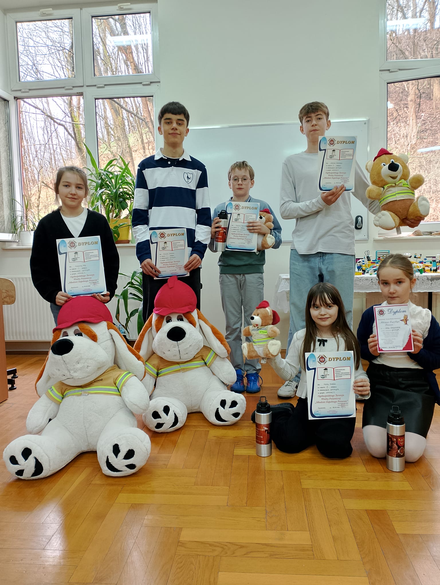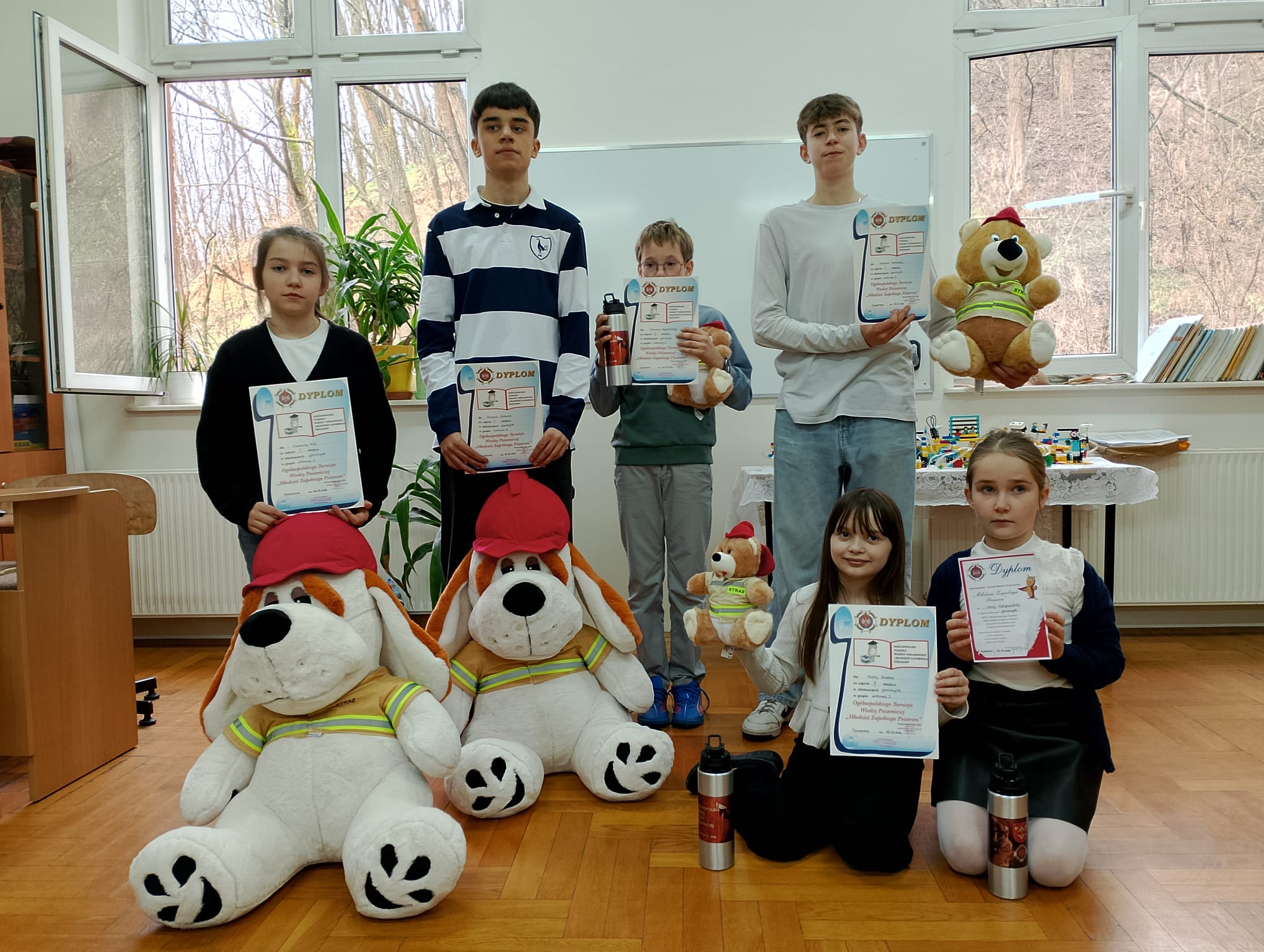 Nasza szkoła odniosła wspaniały wręcz imponujący sukces w Ogólnopolskim Turnieju Wiedzy Pożarniczej, zdobywając niemal wszystkie miejsca na podium i udowadniając wysoki poziom wiedzy oraz zaangażowania uczniów. W rywalizacji wzięli udział: Kamil Zasuwa i Wiktor Stroiwąs z klasy VIII, Julek Stępiński z klasy V, Zuzia Róg z klasy IV, a także nasze najmłodsze, ale niezwykle ambitne uczestniczki – Marta Siudak i Lena Korycińska z klasy II. Podczas eliminacji gminnych nasi uczniowie zaprezentowali się znakomicie.